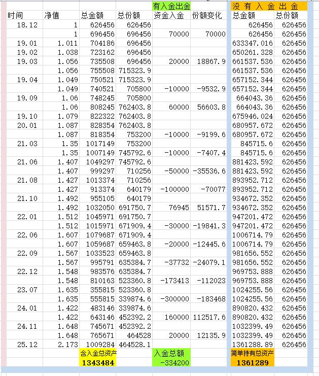 没有有资金进出就不要计算收益率之说,基金净值法就是充分考虑资金进岀时新入资金与原有资金的比值,无论资金如何进出,收益率始终反映真实投资能力,不会因操作而扭曲。举例,一个人买卖股票,第一次投一百万元,赔光。第二次投一百万元,赔光,第三次投一百万元,赔光。第四次投一百万元赔光。第五次投一百万元赔光。第六次投一千万元,获利一千万元。共获利五百万元。表面看投资水平很高,挣了五百万元,实际这种情况下此人的投资水平很垃圾。如果本金固定,此人是五次赔光,一次挣钱,现实情况下,能不能有五次赔光的机会?第六次能不能拿出一千万元,都是极小极小的概率,连续几次赔光后,大概率此人不是崩溃就是自杀,更别说拿出一千万元了。所以有资金进出就不要计算收益率,更不能反映投资者真实的投资水平。打字真累。