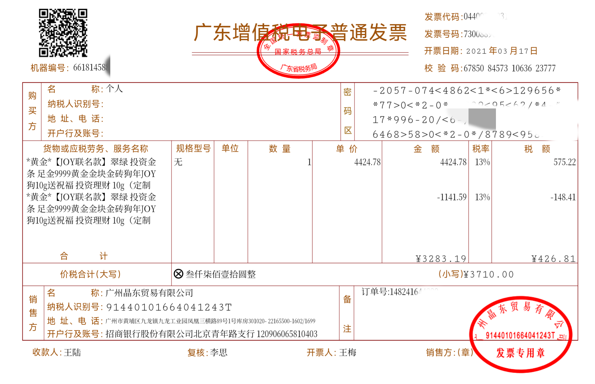 查看了以前其它部分品牌的发票,也跟工行品牌一样,都有13%的税。