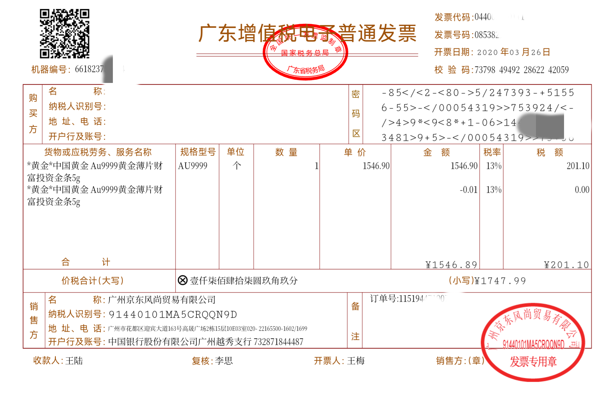 黄金也是同理,比如卖1000元1克,进货价990元,实际是按10元的差价交税的。