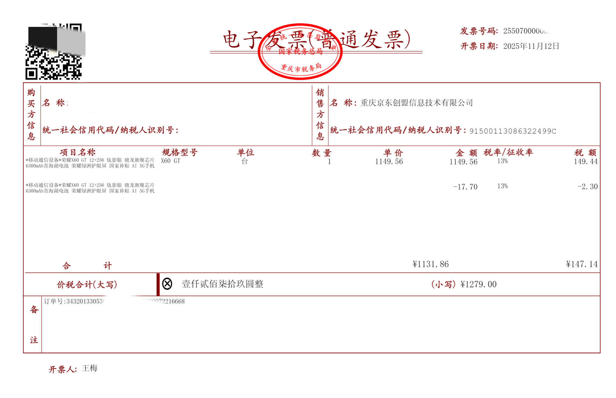 查看了一下去年(2025)买的手机的发票,也有13%的税,
