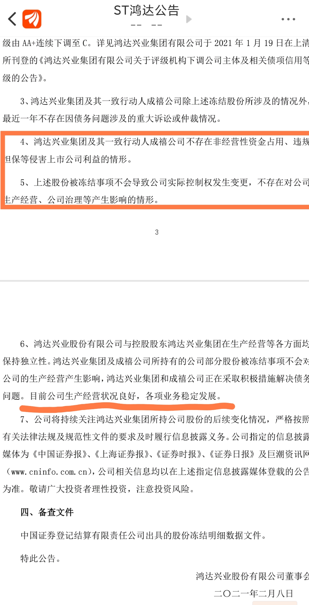 看起来像是把烂摊子扔给国资。鸿达当年大股东违约,上市公司公告: 经营状况良好,各项业务稳定发展