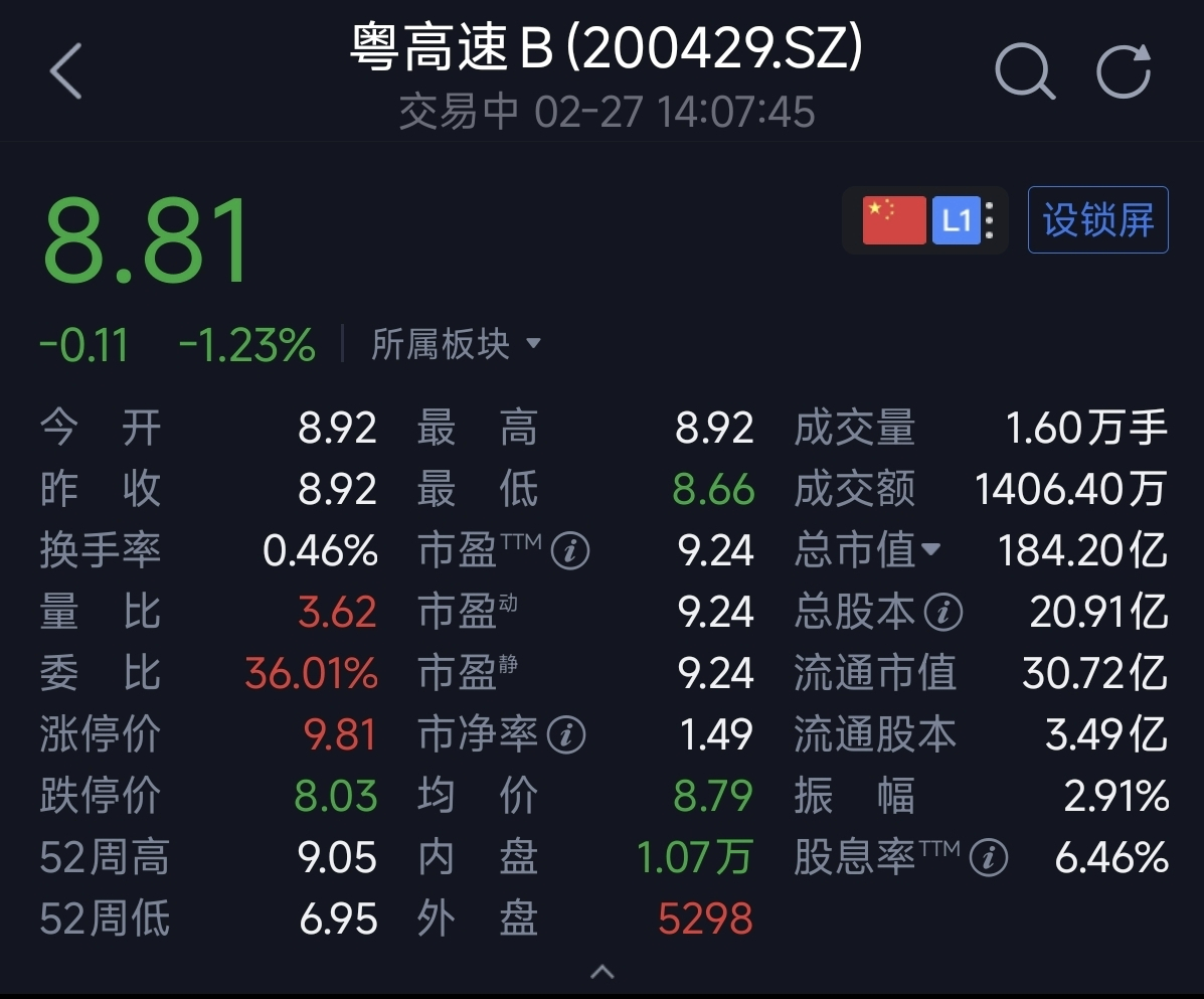 今天想粤高速B和粤高速A出现背离走势,B股折价越来越大,股息率高。长线来说B股是否具有投资价值,各位大佬们怎么看。