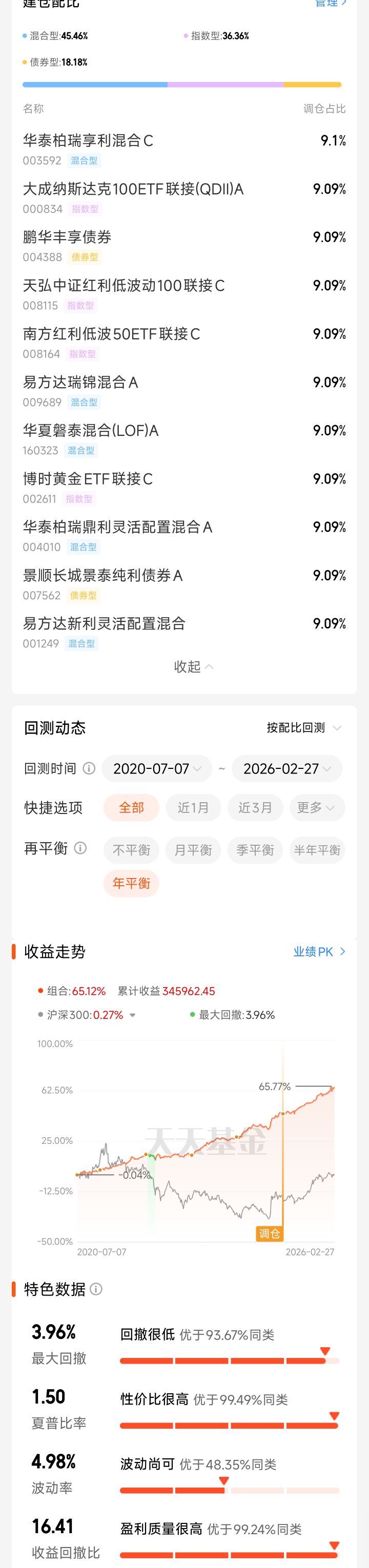 谢谢!未配置现金仓位,债券调高,股票调低更贴合经典永久组合。可能我还是有些贪心,选择了回测收益较高的配比,我再想想是否要调。