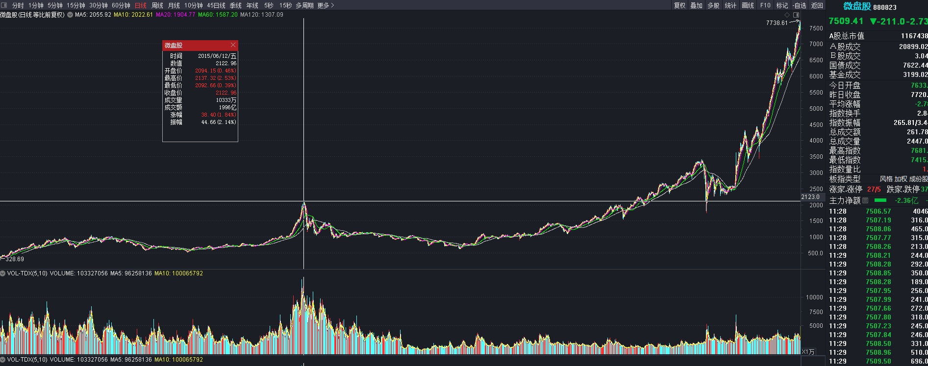 看看880823微盘股指数在本轮牛市中的涨幅,现在就是历史极值,没有之一。现在的指数最高点比起2015年的杠杆牛的最高点2137.32点还涨了262.07%。再看看000902中证流通指数和000985中证全指现在的位置,除了2015年的杠杆牛以外,现在的中证流通和中证全指位置高于历史上的其他任何时期。。。