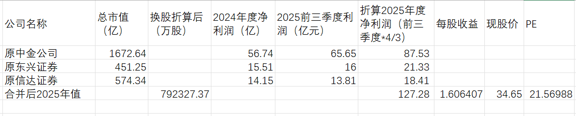新的上市公司的整体股份为792327.37万股,我们就按照这个来估值,考虑到2025年年市场环境好了很多,我们估算2025年第四季度利润是前三季度的平均值,计算合并后的每股收益为1.6064元,按照现在的中金公司的股价,约为PE21.57倍,同样也在合理范围内。