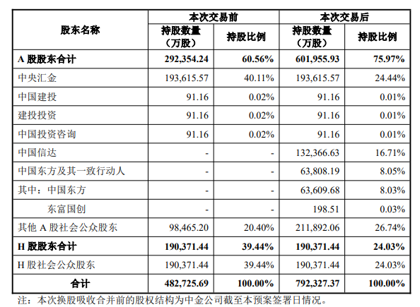 3家公司2025年12月公告,中金公司拟吸收东兴证券、信达证券重组上市,换股比例东兴证券1:0.4373(1股东兴证券可换0.4373中金公司),换股价16.14元,现金选择权13.13元;信达证券1:0.5188(1股信达证券可换0.5188中金公司),换股价19.15元,现金选择权17.79元;中金公司换股价36.91元,现金选择权34.8元。预案公布的重组后的股权变动如下: