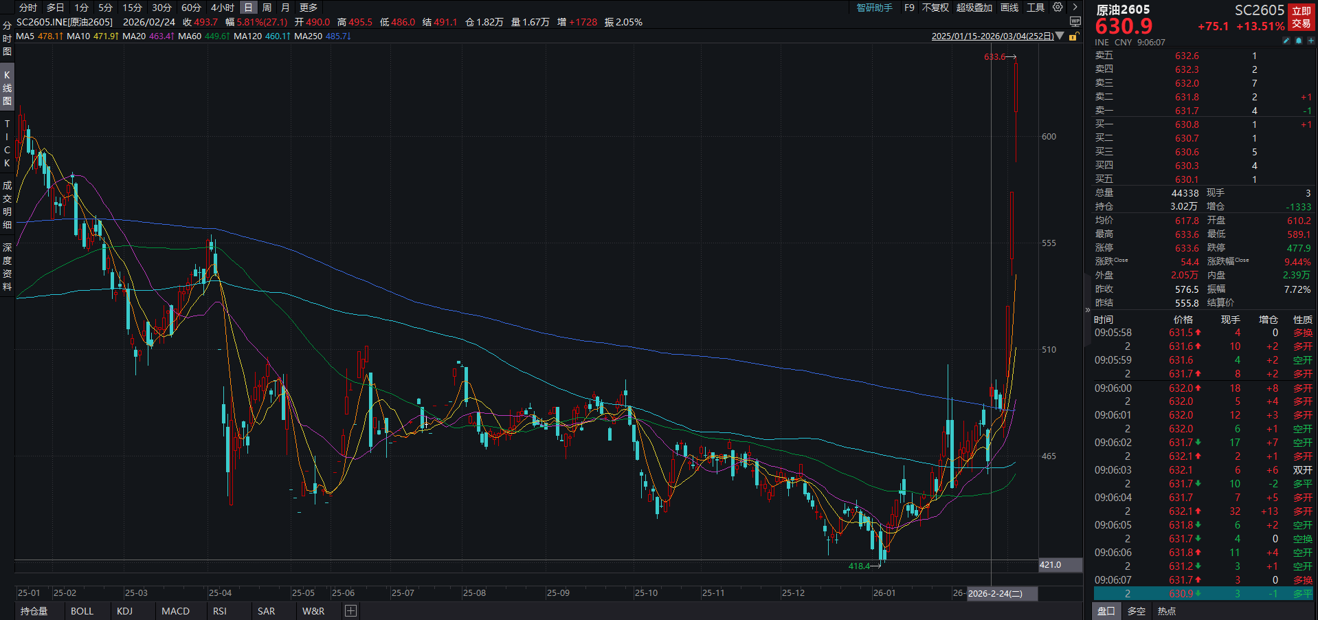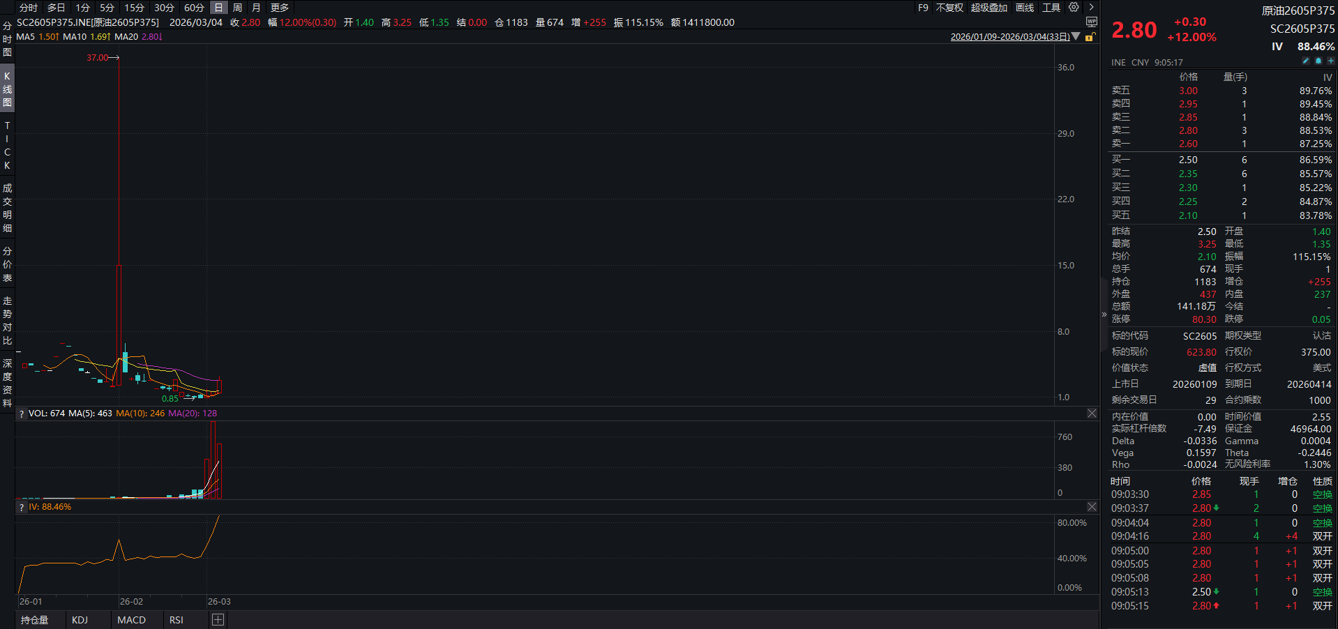 原油价格经历三根大阳线后,SC2605P375价格从低价0.85涨到2.8。(上涨主要是来源于IV暴涨)