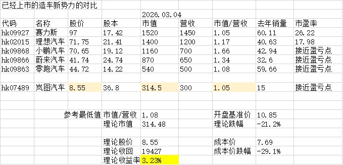 那岚图上市到底值多少钱呢,我们就参考一下其他新能源上市汽车的市值,以现在(2026.03.04)最新市值为参考,计算市值营收比,取目前最低值1.05,岚图去年营收300亿,那市值314亿,对应的理论股价为8.55,对应岚图上市当天跌幅21%,所以理论收益率为3.23%。保本价为岚图上市当天跌29%,再多跌就要亏钱了。