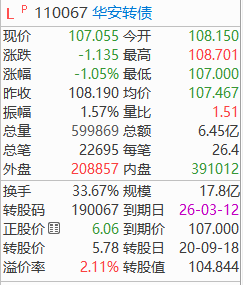 华安转债今天收盘价107.055元,最后交易日3月6日,还有2天时间。