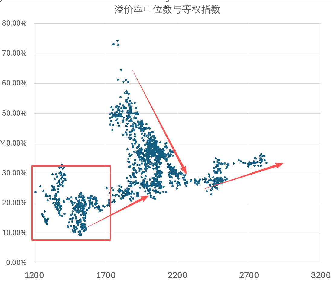 目前没有发现合适的方法,我也尝试用了【转股溢价率中位数】这个指标作了个图。图中,纵坐标为【转股溢价率中位数】,横坐标为【等权指数】