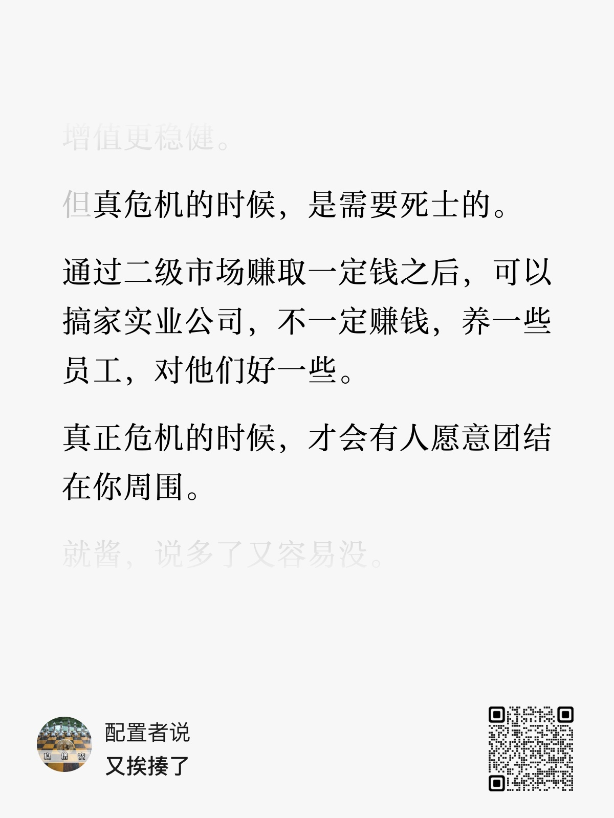 至于你说现在买什么资产,地球上的资源吧。风、光、水、电、盐、油、石头…但是股票也是说不准的。实在不行,开个小店,不至于大富大贵,但有口稀饭吃。就算动荡来了,人都是要吃饭的。