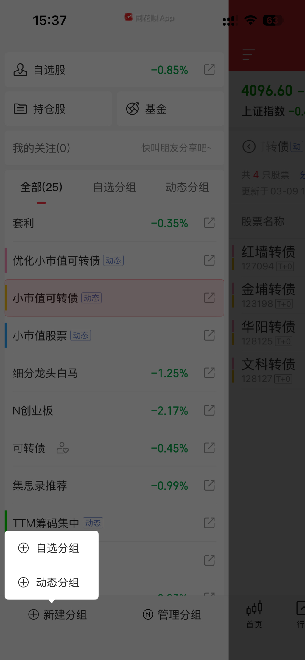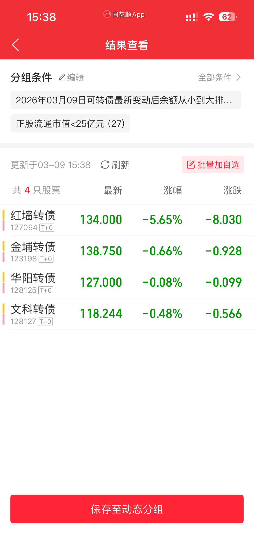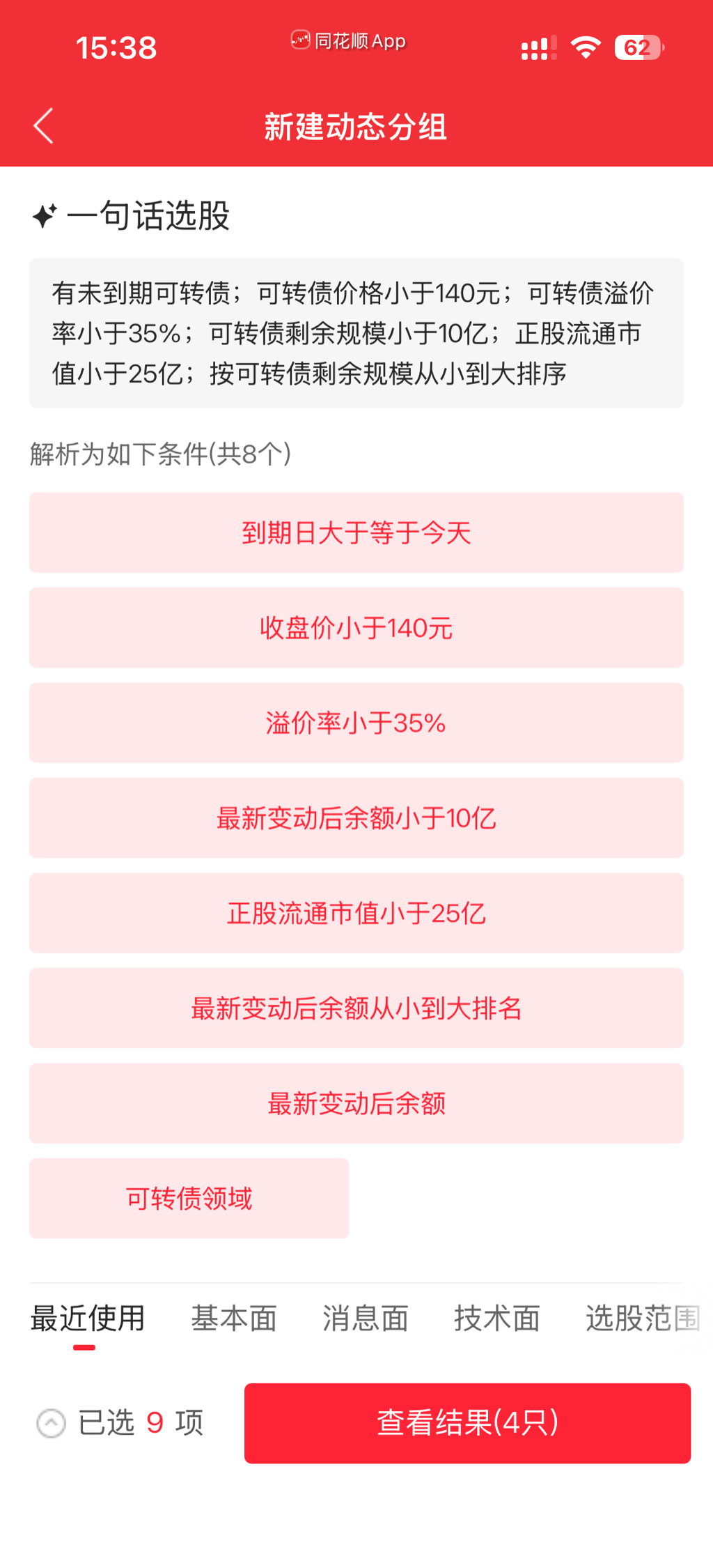 打开手机同花顺app点击左上角的三个杠,点击新建动态分组,输入选股(选债)条件,举例如下:有未到期可转债;可转债价格小于140元;可转债溢价率小于35%;可转债剩余规模小于10亿;正股流通市值小于25亿元;按可转债剩余规模从小到大排序。