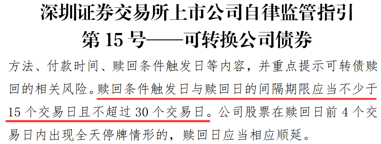 不是公司宣布强赎到最后交易日之间的时长,是想问宣布强赎到“公告”最后交易日、最后转股日这些信息的时长。这个时长由公司自定,只要符合以下规则。