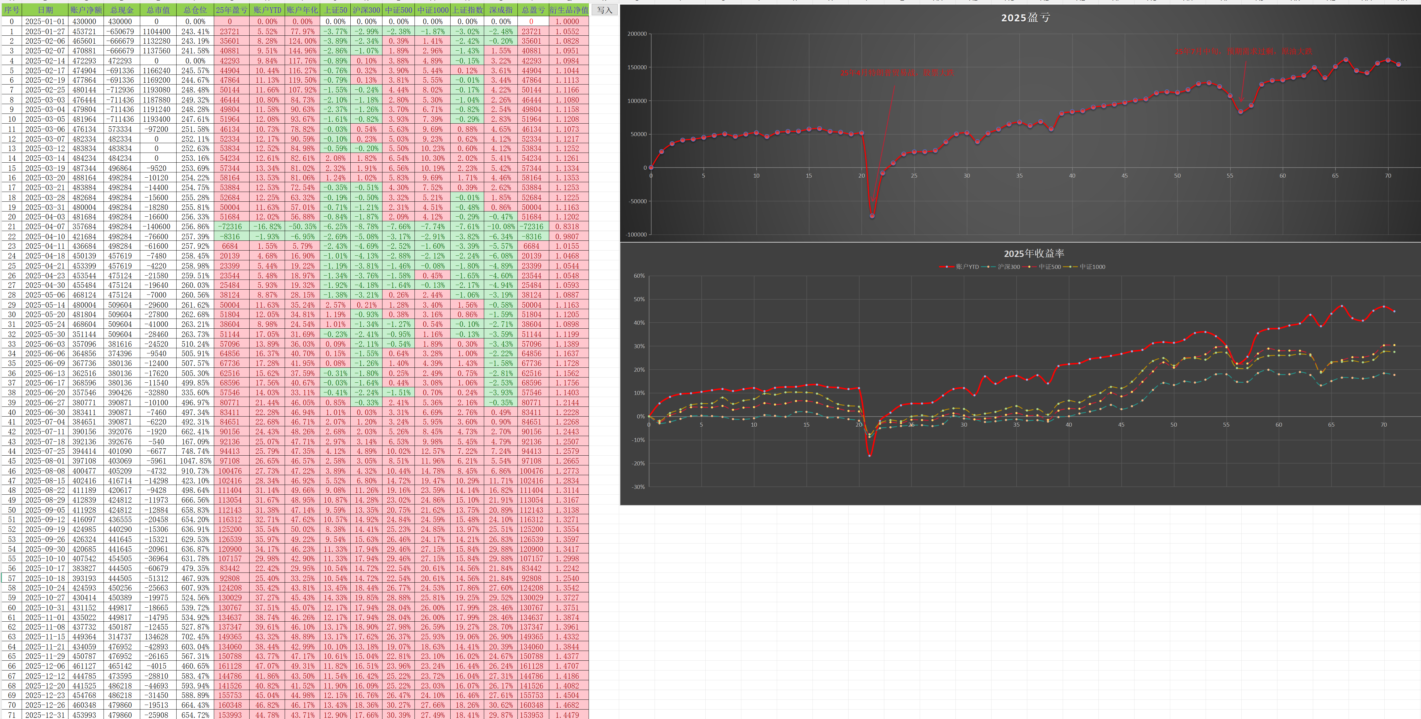 30万本金(25年初43W,5月出金13W),投资期货期权,主要标的物为1000指数,贵金属,原油,铁矿石,期权单腿卖沽为主,还有十债期货,25年取得净值44.78%的成绩,中间有两次大幅回撤,25年4月贸易战股市急跌和7月中旬原油下跌导致。25年收益主要来源1000指数,原油和十债。