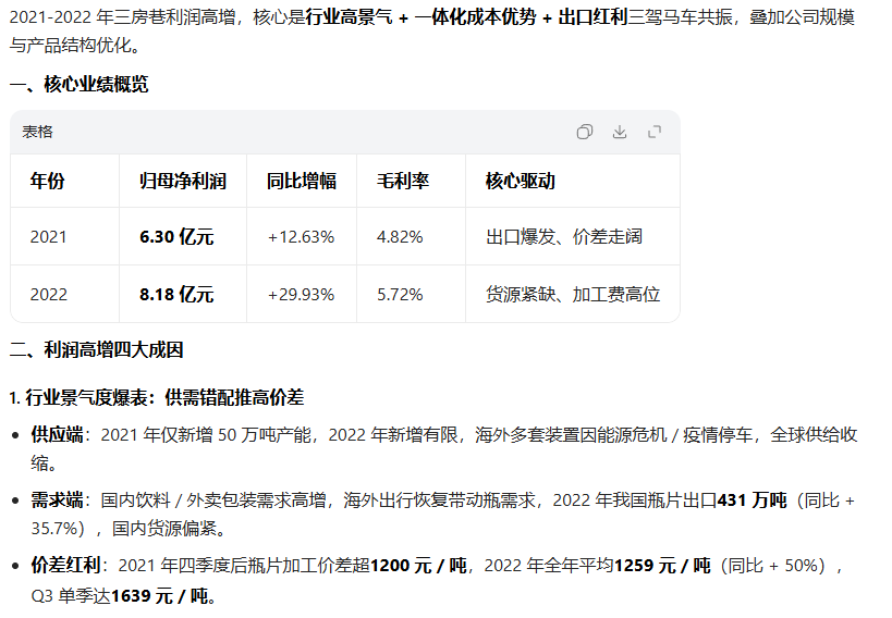 2、业绩起飞。公司25年瓶片扩产完成,目前加工费过千(回到21、22年水平了)。21、22年公司业绩好,主要是出口好,加工费比较高,23-25年业绩差,因为产能过剩,加工费太低了。最近加工费破千,如果持续下去,公司业绩会非常好。