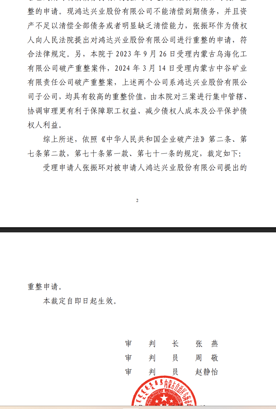 【鸿达兴业股份-R鸿达1停牌】乌海中院裁定受理鸿达兴业股份破产重整申请