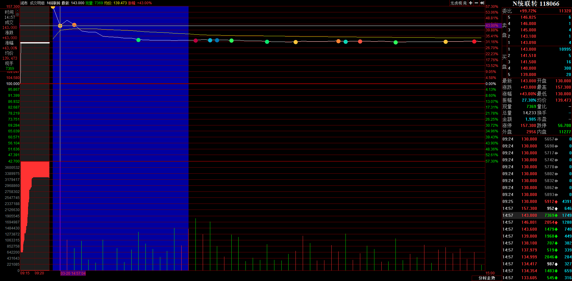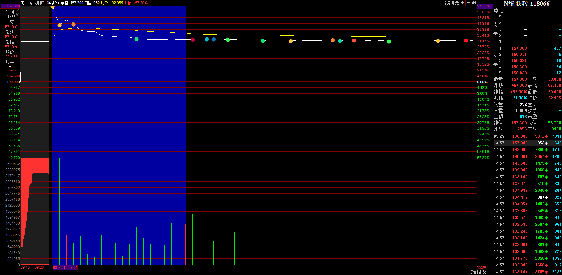 统联转债 上市首日14:57:00复牌时行情逐笔成交截图。157.3元坚持了至少1秒时间,143元坚持了至少10秒时间。说明券商提供的各类“条件单”功能,只要用户设置正确,都能触发卖出。即使手动操作也能成功卖出。