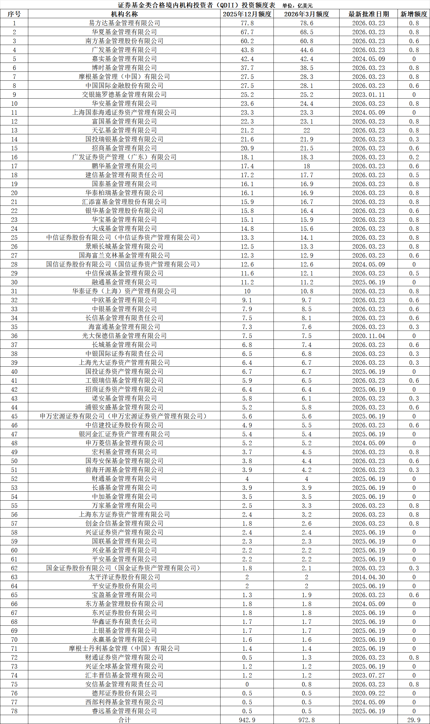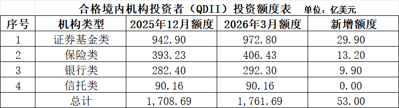 2026年3月,合格境内机构投资者(QDII)投资额度新增53亿美元,其中47家基金、券商合计额度新增29.9亿美元。
