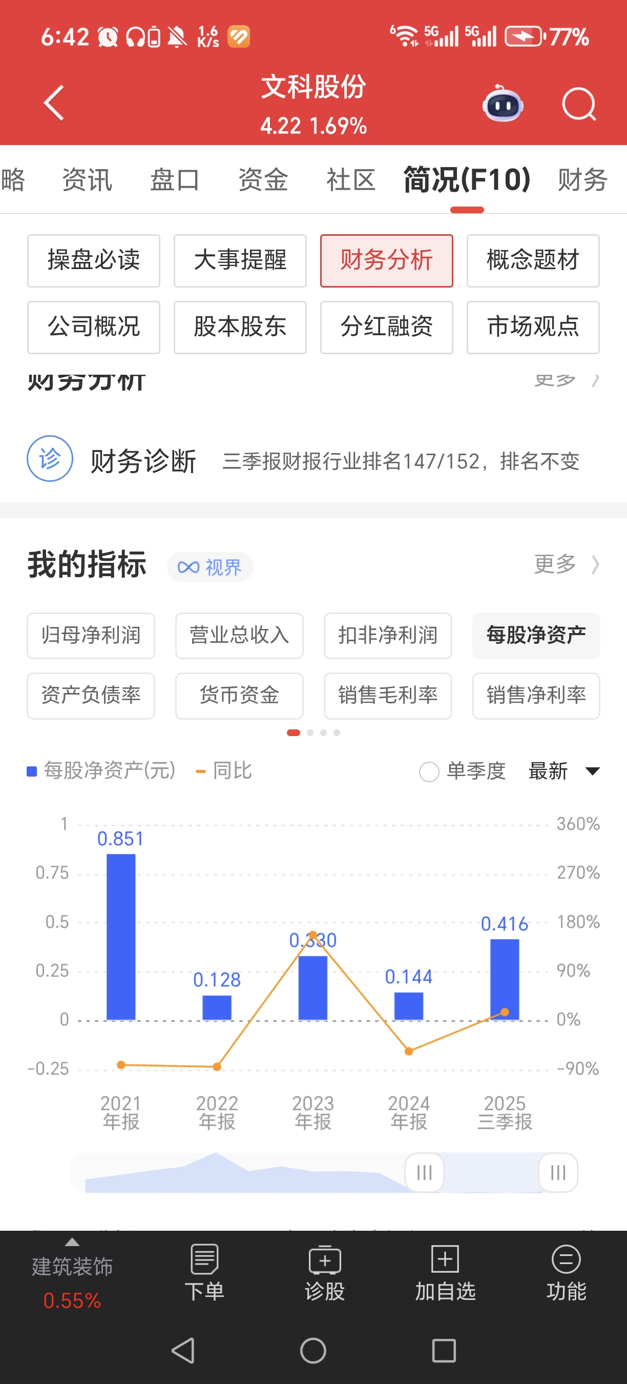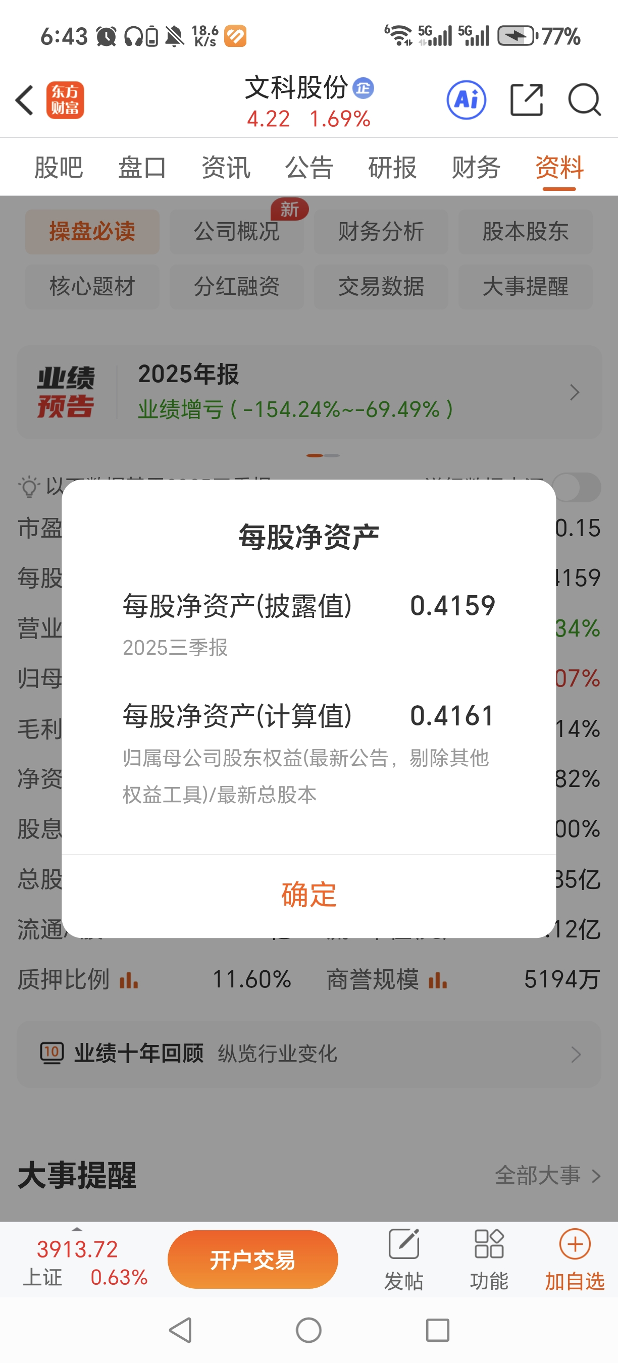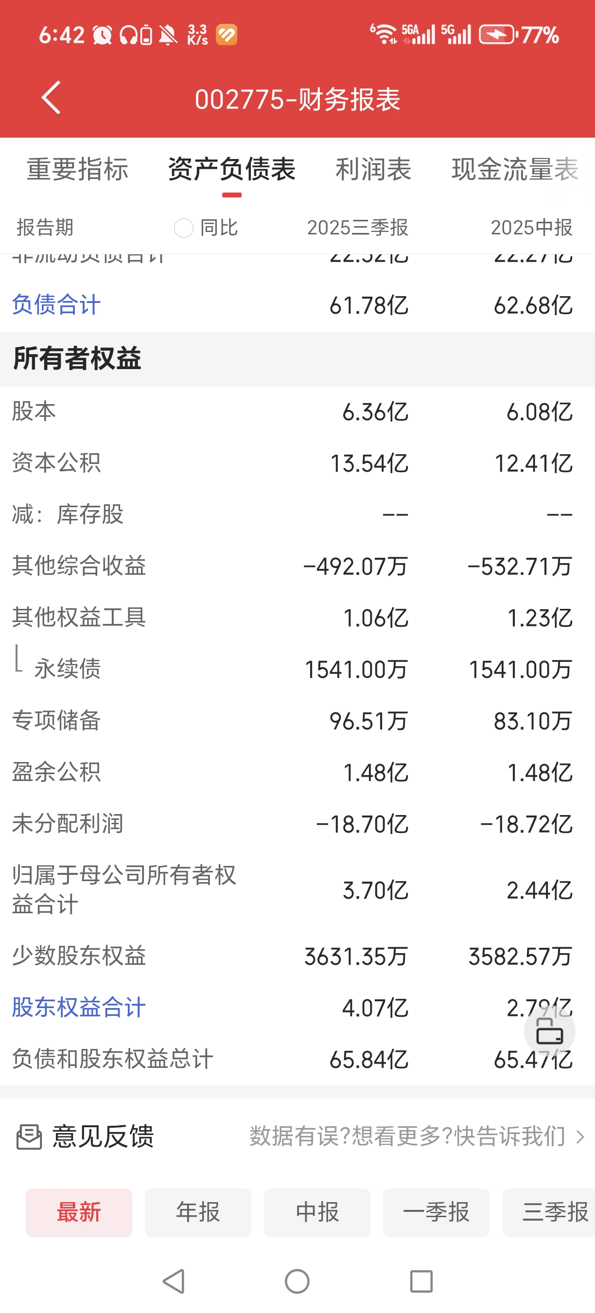 我看了同花顺和东方财富统计的三季度都是0.42,集思录统计的是0.58,我自己也算的0.58。如果按照042算,那么公司三季度净资产是2.65亿,预亏2-3亿,净资产可能会为负,但公司确没有警示退市风险,财报写的归母所有者权益是3.7亿(我觉得这个是净资产,但看同花顺和东方财富计算的结果都是042,我又担心我算错,万一真*st真就完蛋了),所以想请问下大家,是我算错了,还是同花顺算错了,年报后会st吗?