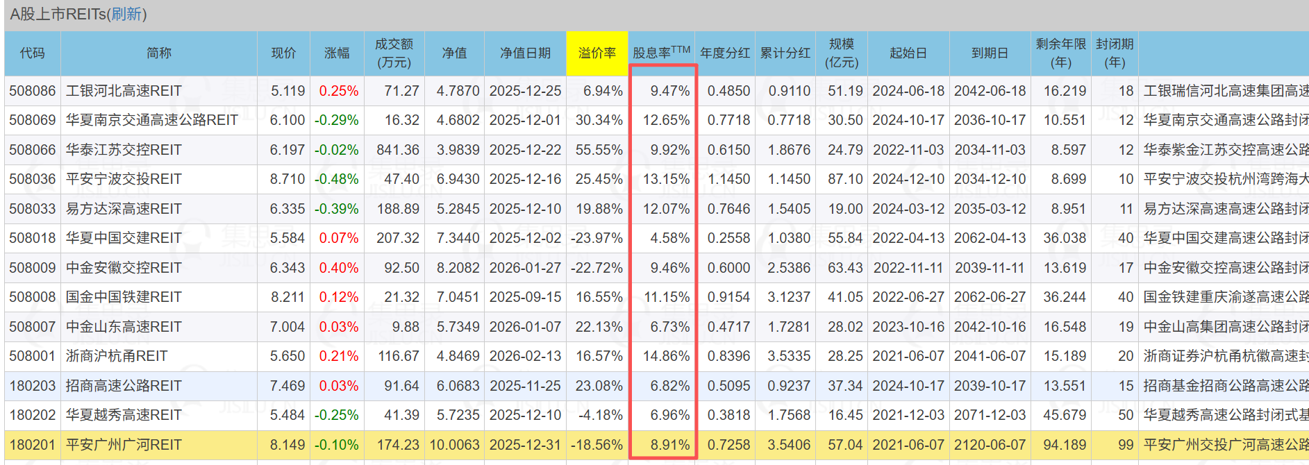 关于高速公路Reit的收益率,我抛砖引玉解释下,以集思录表格中股息率最高的508001为例: