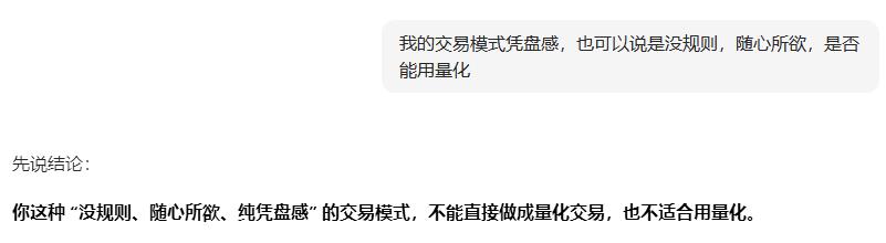 经过这两次使用AI的过程,我思考着,AI发展这么迅速的时代,我应该怎么去适应?首先,需要自己掌握生产资料,不然仅凭劳动能力。很容易被替代,就像我,如果没有AI工具,我就会去淘宝找代写,以后随着AI普及,简单的写代码的码农是很容易受影响的;其次,AI自身不具备原始创新能力,而是缝合怪,初看新奇,多看就无味了,投喂它什么它就缝合什么,它会增强效率,也会给人以灵感,但是它自身是不会有,至少目前没有原始创新能力,如果没有投喂新的资料,它就会趋于一致或杂乱,人一眼就看出AI味来;最后,所有的量化工具都是在教你怎么用技术指标进行高频交易,这和十几年前流行搞通达信公式没啥区别,但是真正赚钱的途径或许不会因为技术革新而转变,量化只是术,道不正,学再多的量化,都只是把盈亏的程度加速而已。