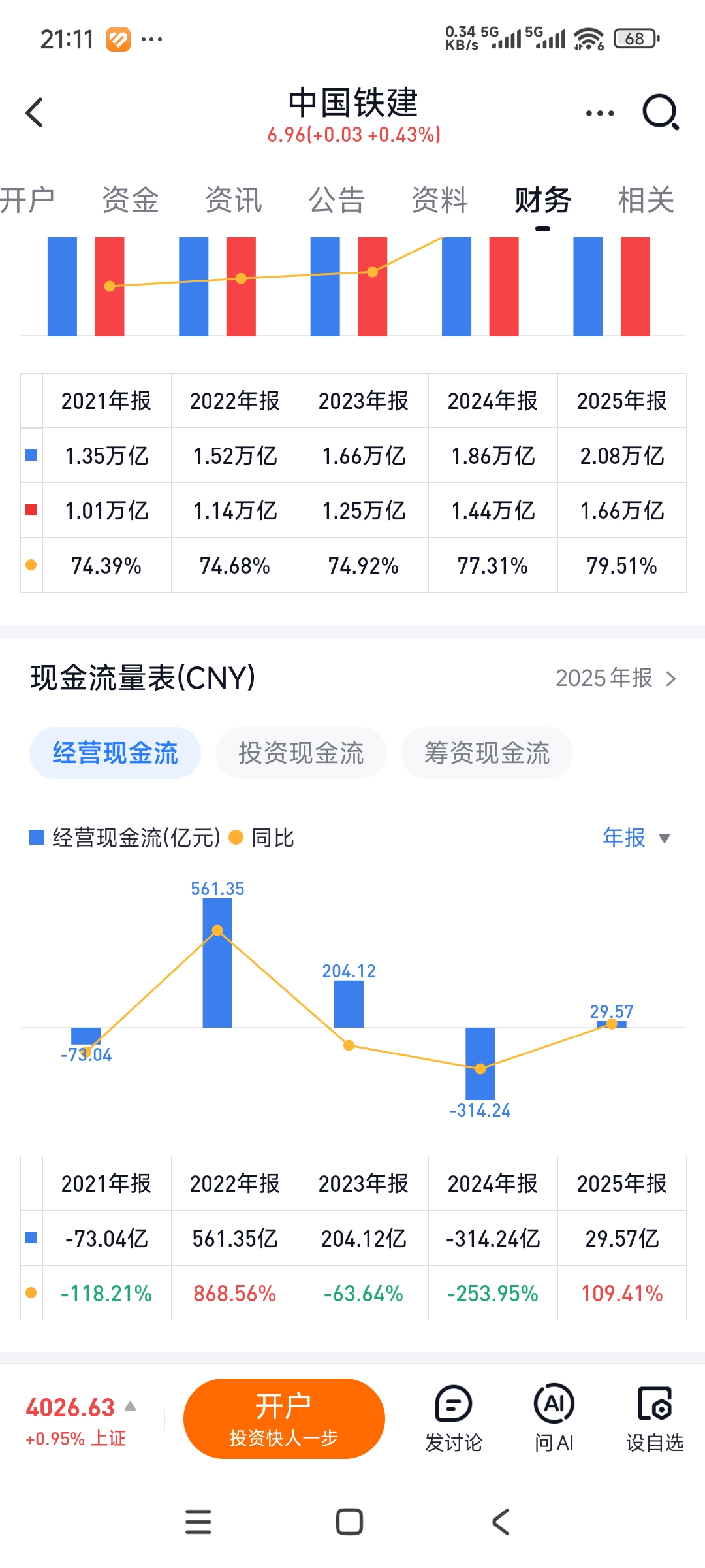 2、中国铁建,市净率0.25,股息率6.28%。目前H股比A股折价31%,连续10年分红,ROE 4.78%,同样是2023年以来收入及利润持续下降,近一年利润下降17%但持续盈利,净资产年化增长率11%。
