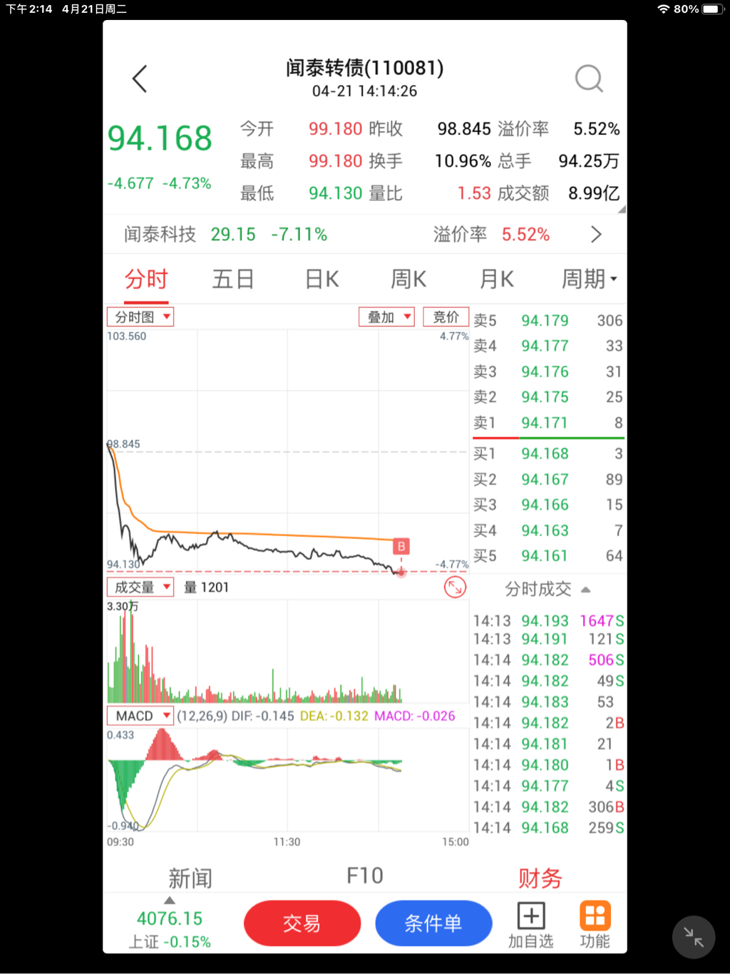 转债午盘成交了472亿,比昨日少2亿,指数下跌了0.72%,A股成交了15839亿,比昨日少1400亿...转债上午调整,幅度不大...上午减 华特 华兴 帝尔 等各部分,95买入了少少闻泰...