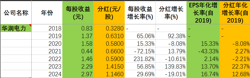 华润电力2019–2024年每股盈利复合增长率(CAGR)为16.74%,2019–2024年每股分红复合增长率(CAGR)为12.68%,考虑到未来增长的不确定性,未来10年(T1)的分红增长率预测为年化6%,计为g1。在永续期间(T2),按照2%计算,计为g2.