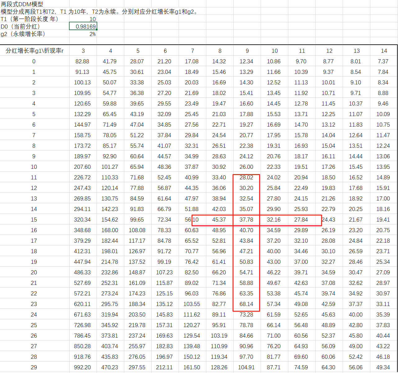 有个疑问请教一下,这个近5年净利润复合增速只有百分之2点几,分红复合增速却有百分之20几,感觉不适用于这种模型,因为这个模型的一般是要收益增长率大于股价的增长率,而且你指定收益率要达9%,前几年复合收益率才2%,怎么突然就能到9%呢据我所知,DDM模型(股利贴现模型)是一个绝对估值模型,和股价应该没有关系。