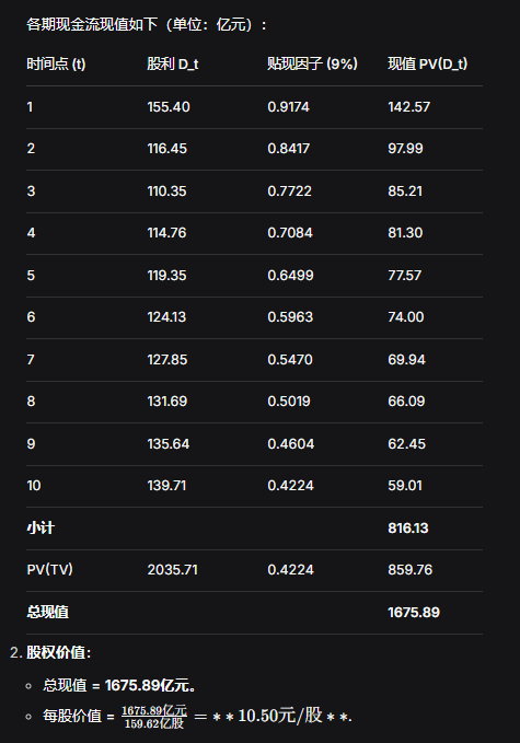 2027年 1.85 1.85÷(1 + 9%)^2≈1.55 2034年 4.14 4.14÷(1 + 9%)^9≈1.91