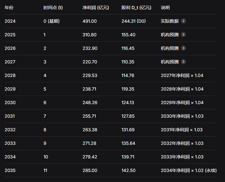 ◦ 股利支付率:公司当前股利支付率稳定在33.06%,且机构未预测该比例大幅变动,故假设各阶段股利支付率保持不变,股利增长率等同于归母净利润增长率。