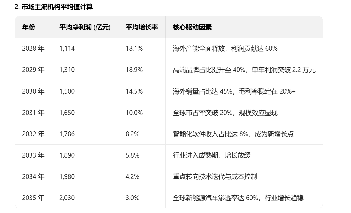 ◦ 各阶段增长率:参考多份机构研报,结合公司海外扩张、舱驾一体业务推进节奏,划分增长率如下:第一阶段(2026 - 2028年)为高速增长期,取25%、23%、26%(对应机构预测2025 - 2027年归母净利润增速);第二阶段(2029 - 2031年)增长放缓,取20%、18%、15%(海外产能释放放缓,竞争加剧);第三阶段(2032 - 2035年)平稳过渡,取10%、8%、5%、3%(逐步趋近永续增长率)。