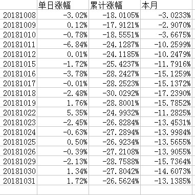 本月大跌,这个月亏掉了是前九个月下跌的总和,从7月份换股到现在来看果然又换错了,换股的时候银行几乎就是最低点,换到期货里以后期货一路下跌,如果不换的话,现在的本金应该是97万,银行可以多赚16万,期货可以少亏14万,少赚加上多亏的一共大概有30万的盈亏差距