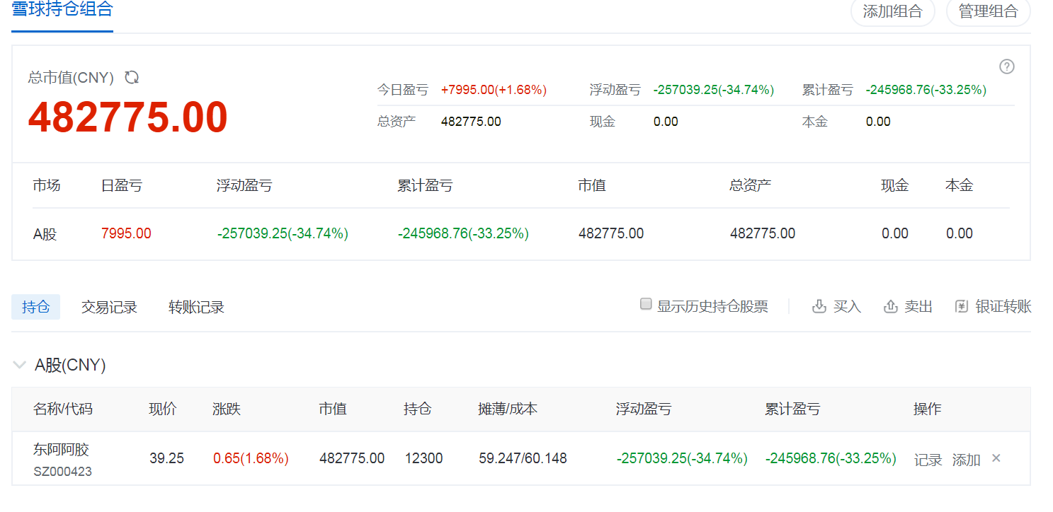 价值投资 只看过去不看未来 确实是大忌, 我也犯过惨重的代价。 最后上一张我在雪球的持仓, 今年上半年 阿胶跌停那次 若不斩仓我的亏损将不是 8万 而是 25 万。 @阳明门徒
