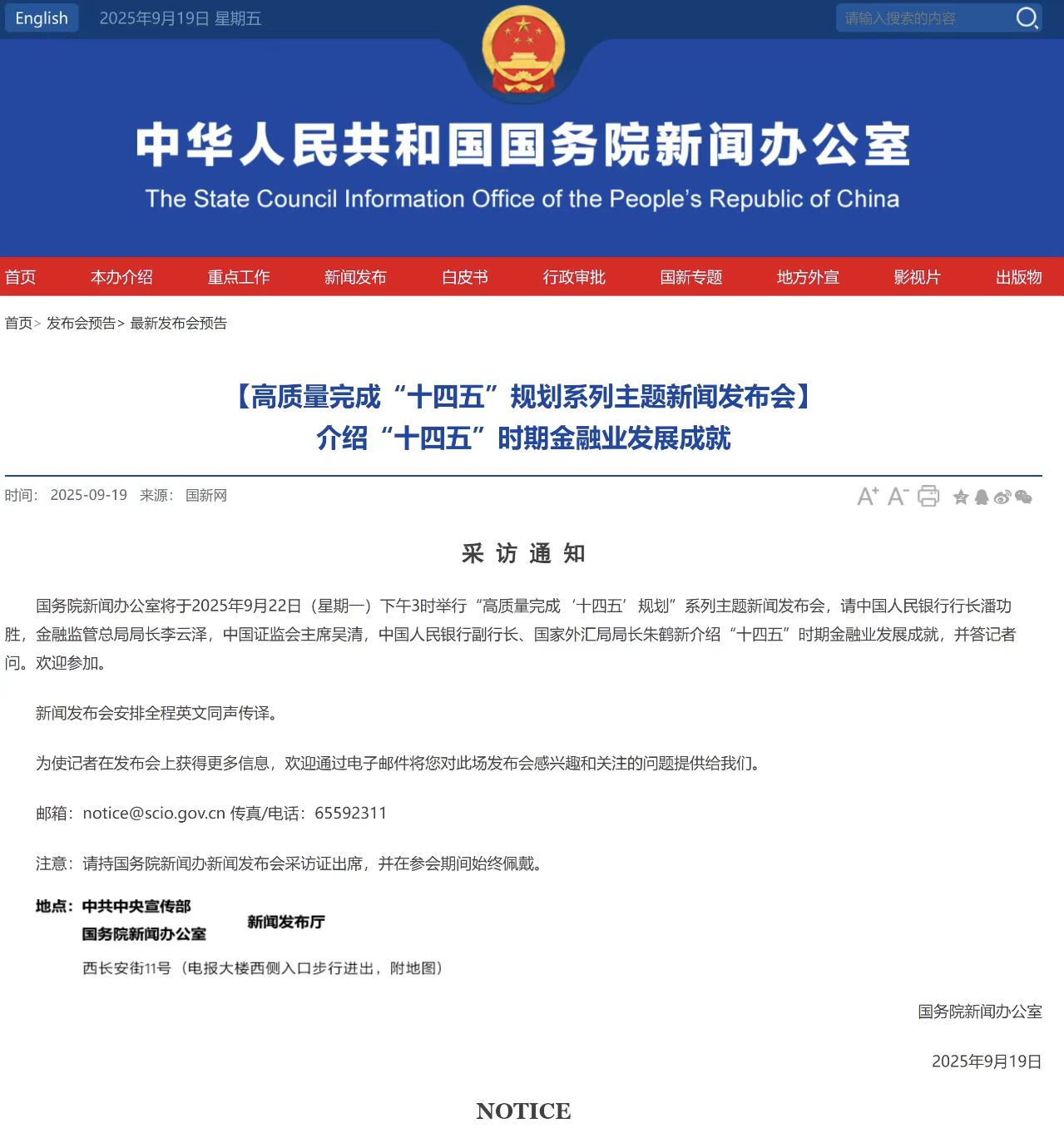 国务院新闻办公室将于2025年9月22日(星期一)下午3时举行“高质量完成‘十四五’规划”系列主题新闻发布会,请中国人民银行行长潘功胜,金融监管总局局长李云泽,中国证监会主席吴清,中国人民银行副行长、国家外汇局局长朱鹤新介绍“十四五”时期金融业发展成就,并答记者问。