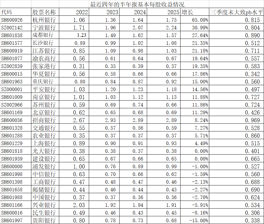 截止10月28日晚已经公告的业绩,我纳入我的系统的几个银行中,如果只看基本每股收益增长情况: